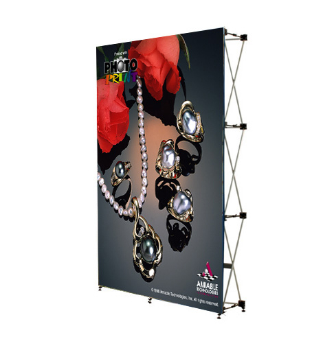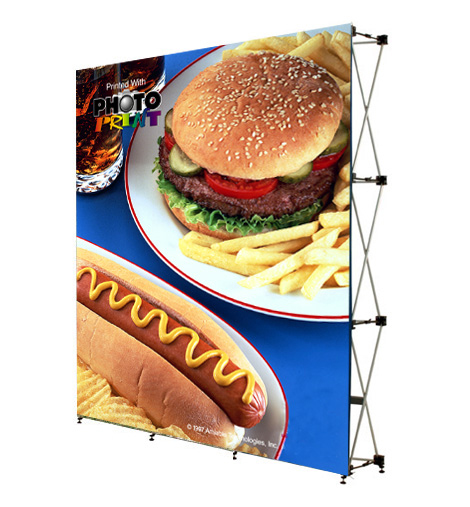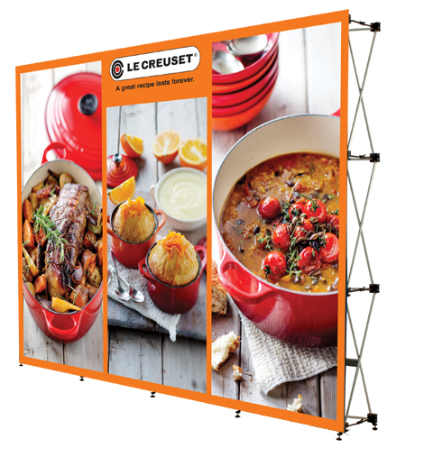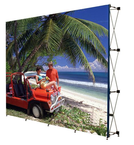 Fabric Banner walls consist of a lightweight frame which literally expand up to create a skeleton frame which then holds the graphic panels in place. The graphics are printed on a durable Fabric & attached to the frame by means of velcro strips.